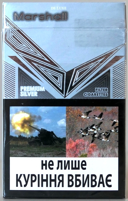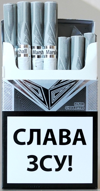 Оформлены в патриотическом стиле. На переднем плане надпись – «Слава ЗСУ» и на задней стороне пачки надпись «Не лише куріння вбиває»